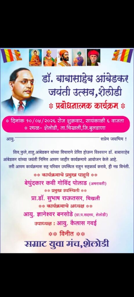 चिखली (प्रतिनिधी): तालुक्यातील शेलोडी येथे बेधुंदकार कवी गोविंद पोलाड (अमरावती) यांचा प्रबोधनात्मक कार्यक्रमाचे आयोजन दि.१०.०४.२६ शुक्रवारला सायंकाळी ६.०० वाजता शेलोडी येथे करण्यात आले आहे. या कार्यक्रमाचे प्रमुख पाहुणे प्रबोधनकार,बेधुंदकार कवी गोविंद पोलाड (अमरावती), प्रमुख उपस्थिती म्हणून प्रा.डॉ. सुभाष राऊत चिखली, कार्यक्रमाचे अध्यक्ष ज्ञानेश्वर बनसोडे (ग्रा.प. सदस्य, शेलोडी) उपाध्यक्ष आयु. कैलास गवई राहणार आहेत. शिव, फुले, शाहु, आंबेडकर यांच्या विचाराने प्रेरित होऊन विश्वरत्न डॉ. बाबासाहेब आंबेडकर यांच्या जयंती निमित्त प्रबोधनात्मक कार्यक्रमाचे आयोजन करण्यात आले आहे .तरी पंचक्रोशीतील धम्म उपासक ,उपासिका बहुजन बांधवांनी या प्रबोधनात्मक कार्यक्रमाला हजारोच्या सख्येने उपस्थित रहावे असे आव्हान सम्राट युवा मंच, शेलोडी यांच्या वतीने करण्यात आले आहे.