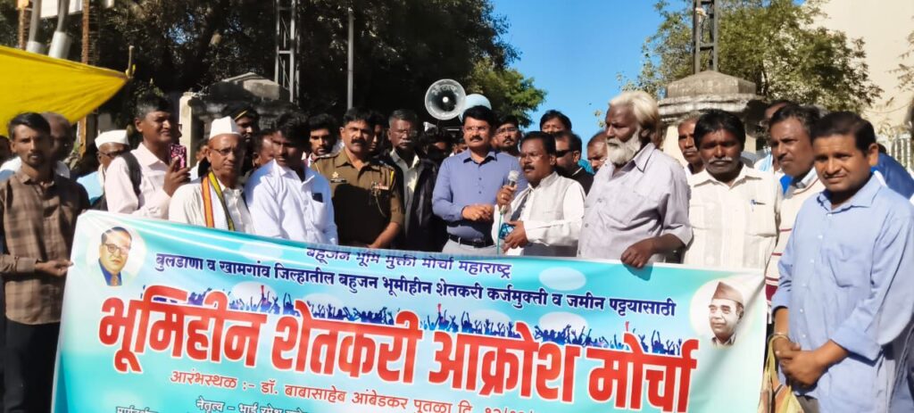 बुलडाणा जिल्हा व संभाव्य खामगांव जिल्ह्यातील शेतकरी, कामगार,भूमिहीन अतिक्रमण धारक कष्टकऱ्यांच्या विविध न्याय मागण्यांकडे शासनाचे लक्ष वेधण्यासाठी दि.१२.१२.२०२५ ला प्रचंड ‘”भूमिहीन शेतकरी आक्रोश” मोर्चा’ काढण्यात आला होता.या मोर्चात मोठ्या संख्येने शेतकरी, कष्टकरी, बेघर नागरिक व अतिक्रमणधारक सहभागी झाले होते.