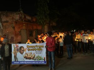 सायंकाळी भारतीय बौद्ध सभा आणि वंचित बहुजन आघाडी यांच्या संयुक्त विद्यमाने शांततेत मशाल व मेणबत्ती यात्रा काढण्यात आली. लहान मुलांपासून ते ज्येष्ठ नागरिकांपर्यंत सर्वांनी हातातील प्रज्वलित मशाली आणि मेणबत्त्यांसह यात्रेत सहभाग घेतला. “तेरा मंगल, मेरा मंगल, सबका मंगल होय रे…” या मंगल घोषणांनी वातावरण भारले होते. गावातील रस्ते, चौक आणि स्मारकाभोवती मेणबत्त्यांचा प्रकाश पसरताच वातावरण अधिकच भावविवश आणि प्रेरणादायी बनले.